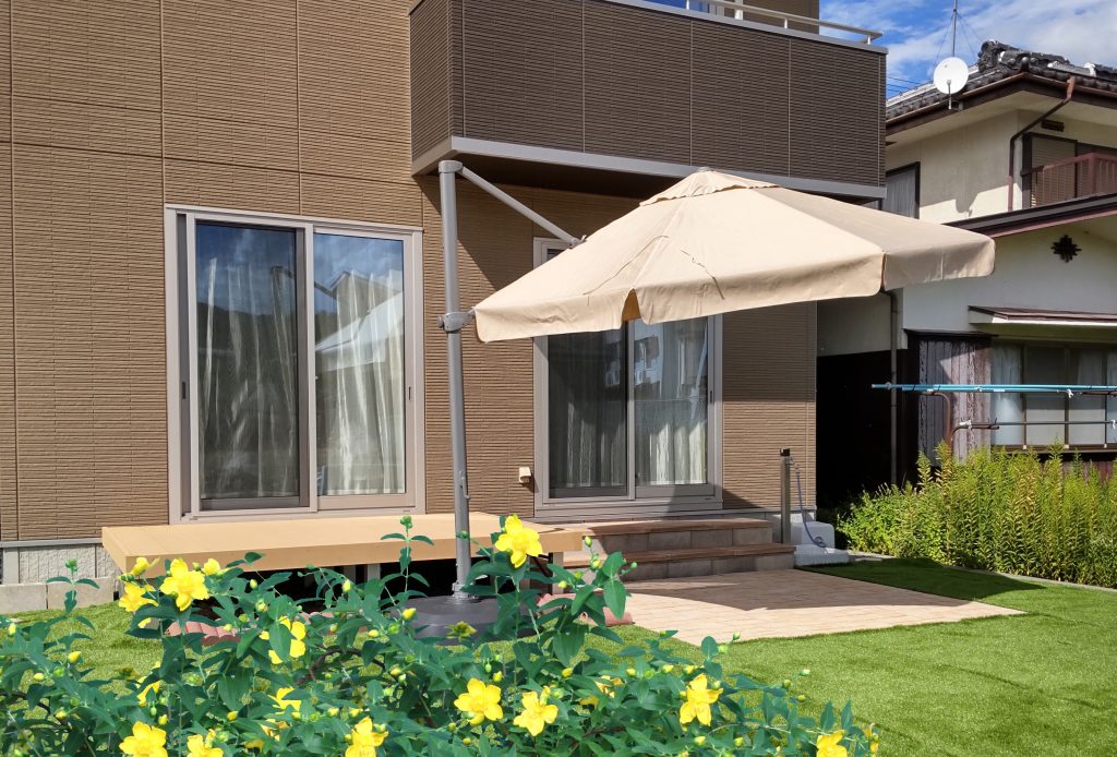 日差しに合わせて角度調整や回転ができるパラソルのあるお庭です。
