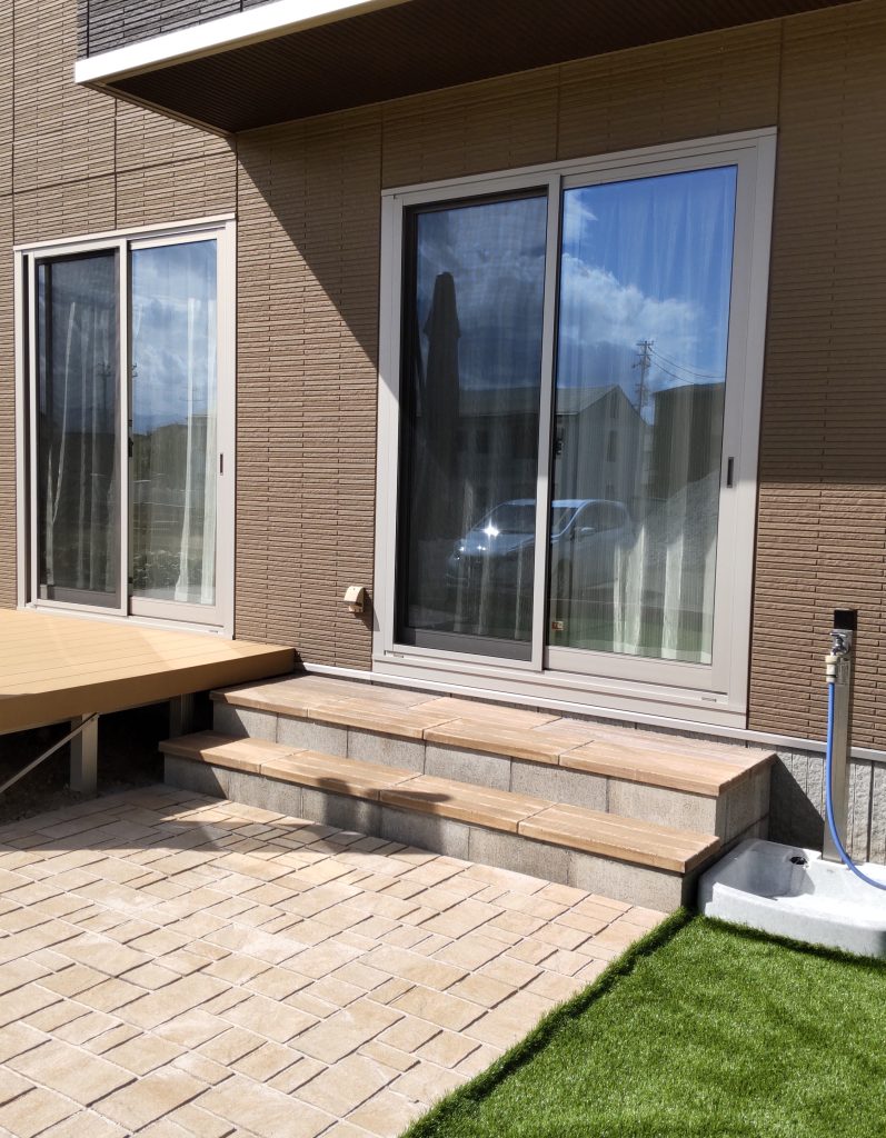 掃き出し窓とインターロッキングテラスをつなぐ階段。
