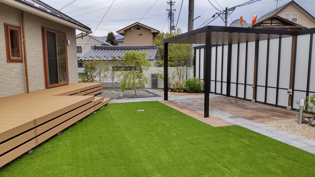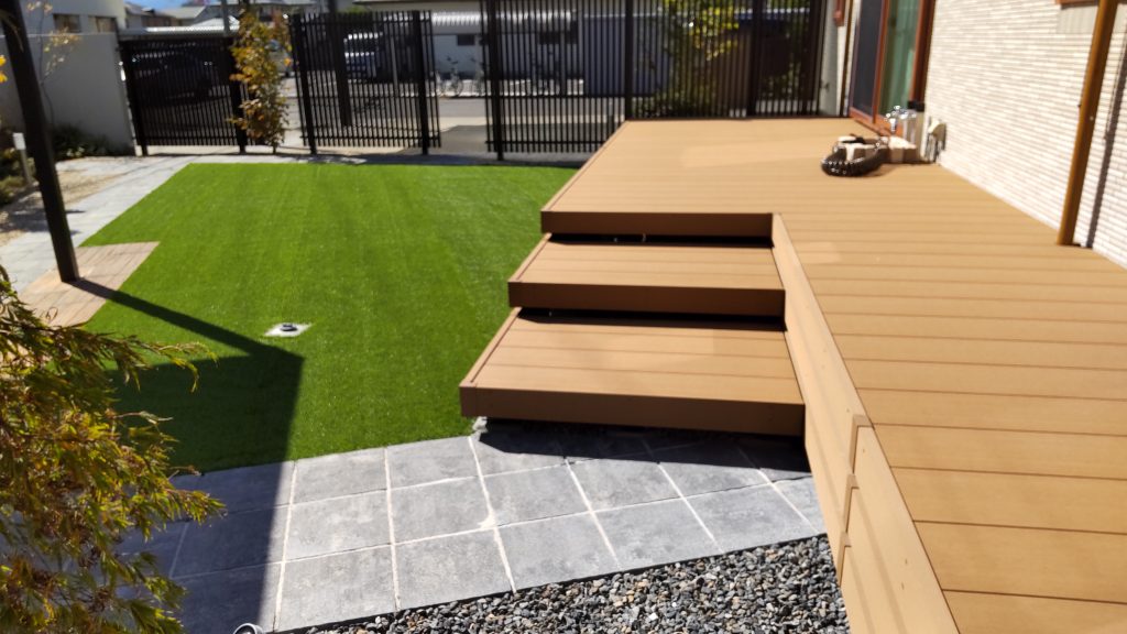 部屋とガーデンをつなぐ人工木のウッドデッキ。