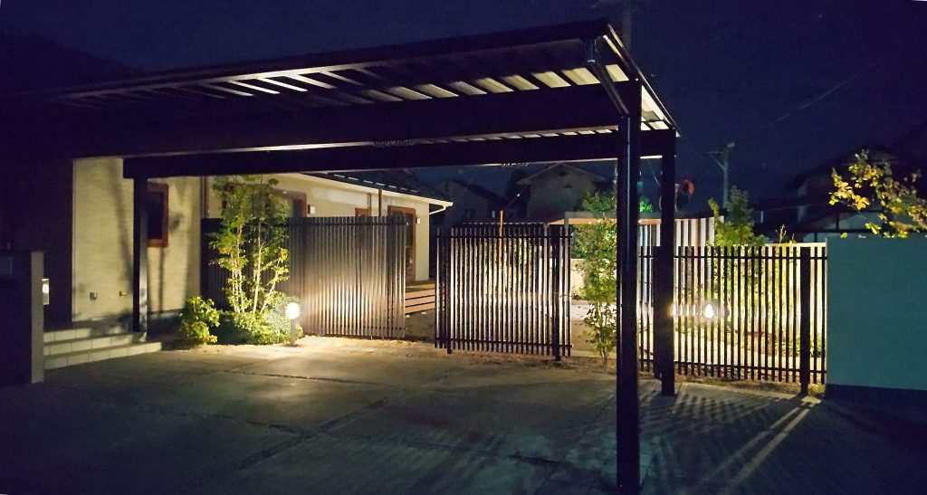 縦格子からこぼれる光が夜の庭へと誘う外観になりました。