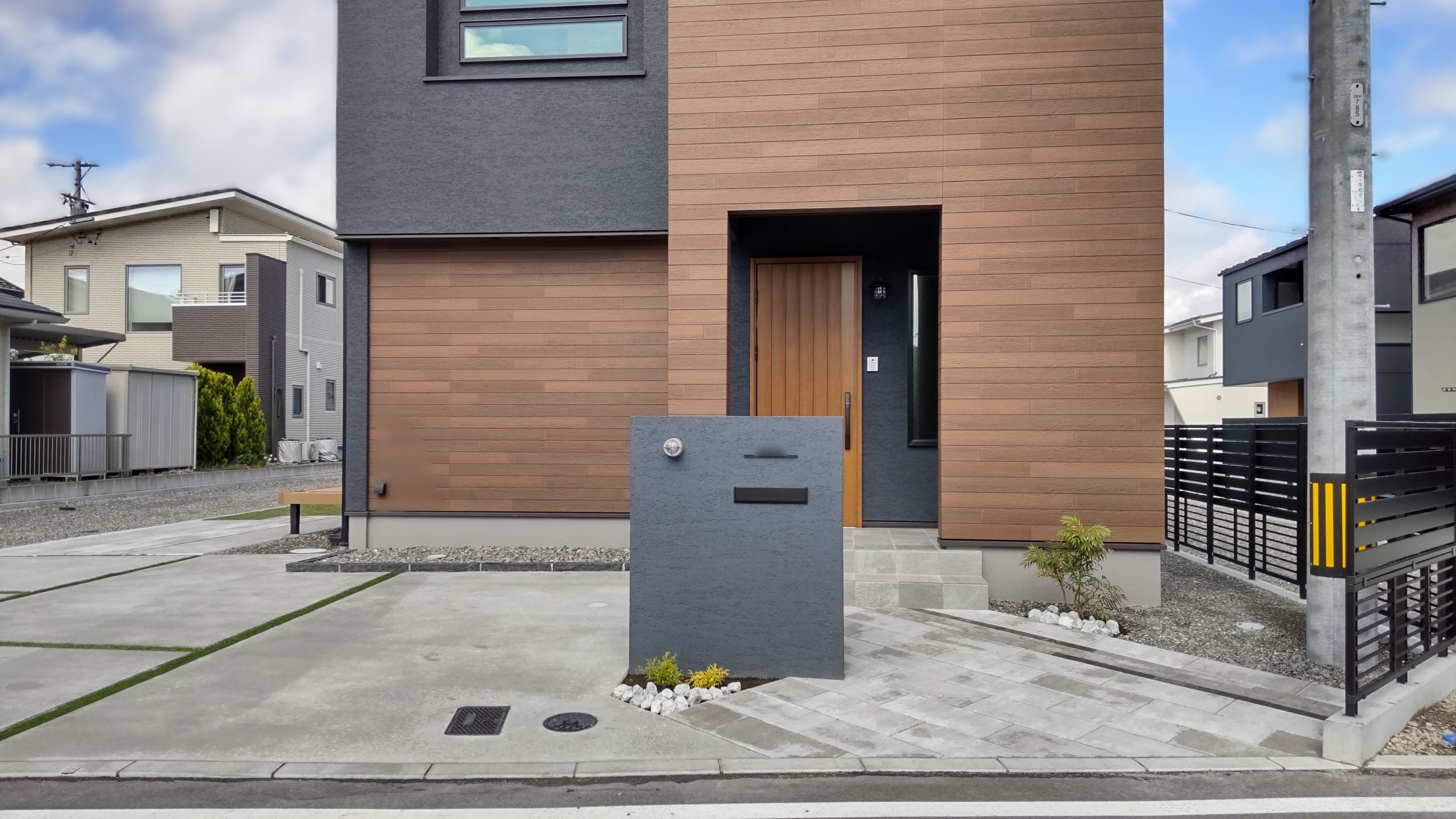 お家の外壁に合わせたグレーの門柱と植栽の緑が映える