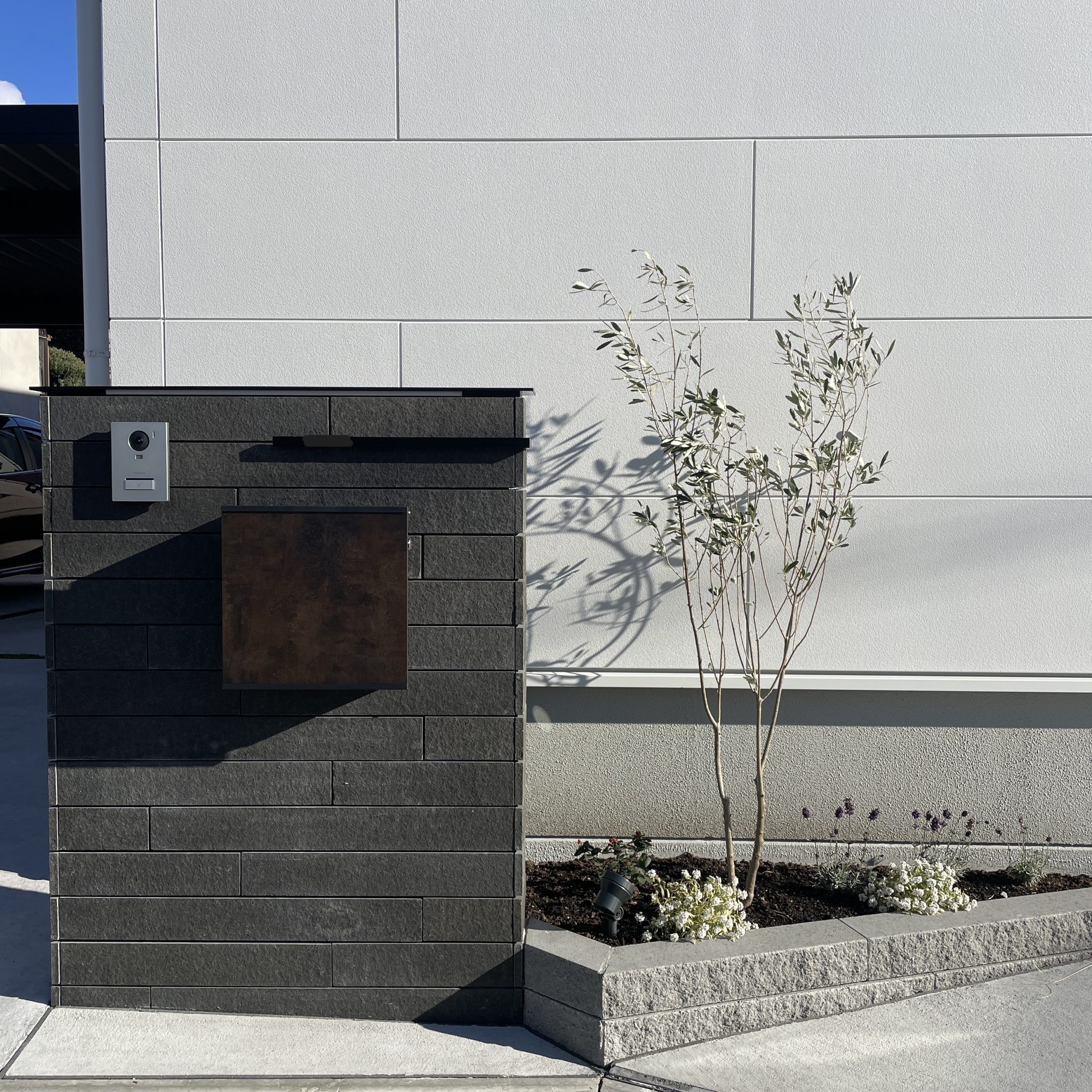 オリーブのシルバーリーフが白い外壁のアクセントに