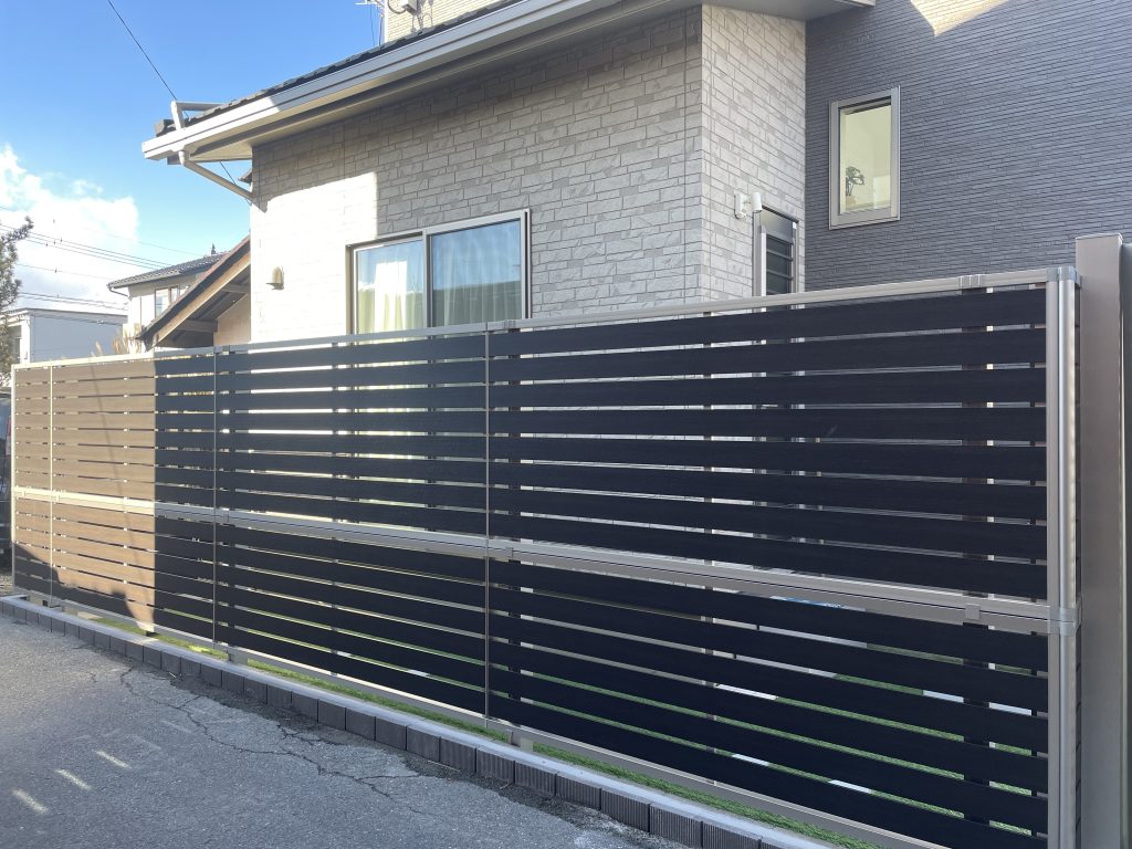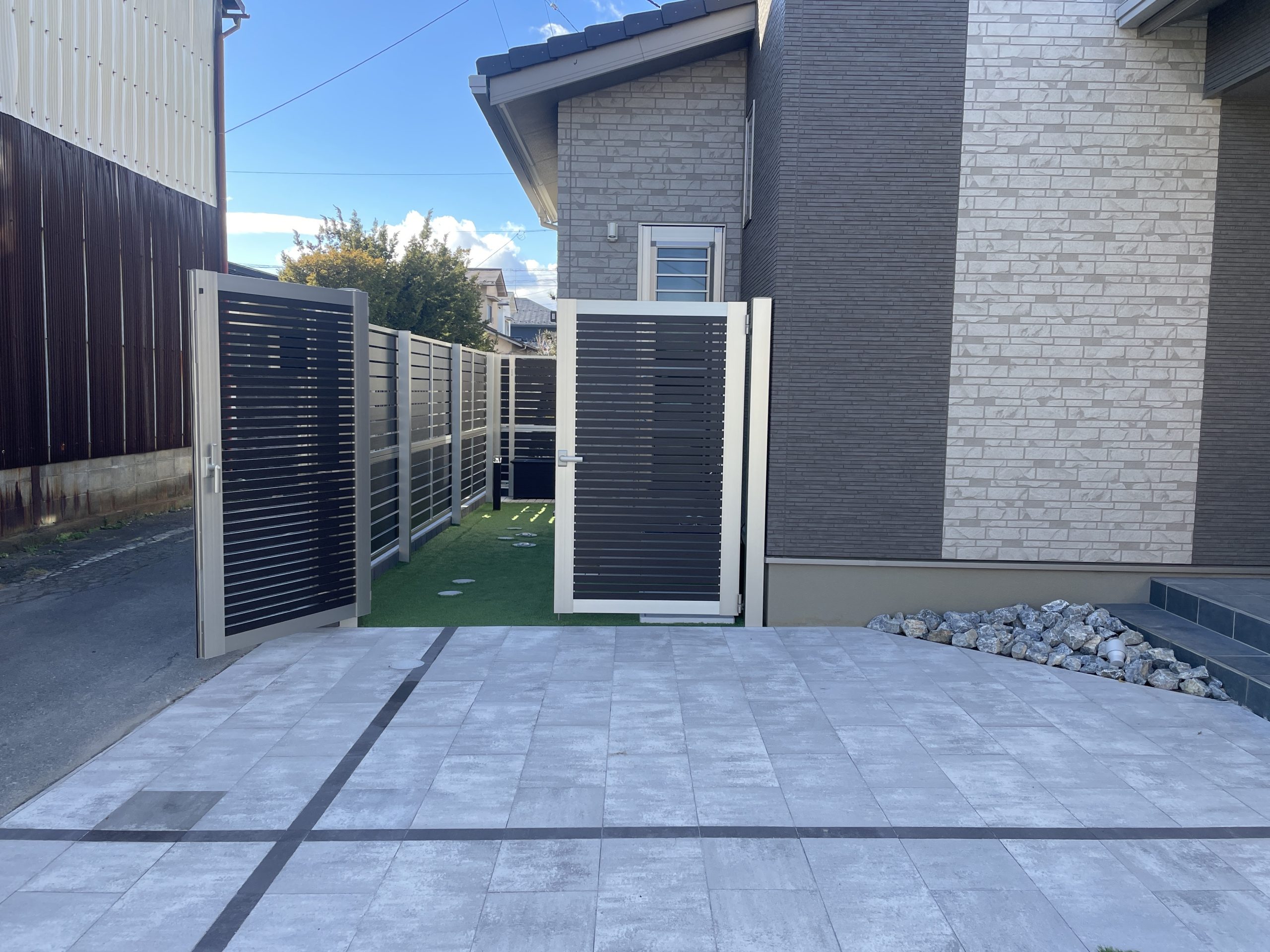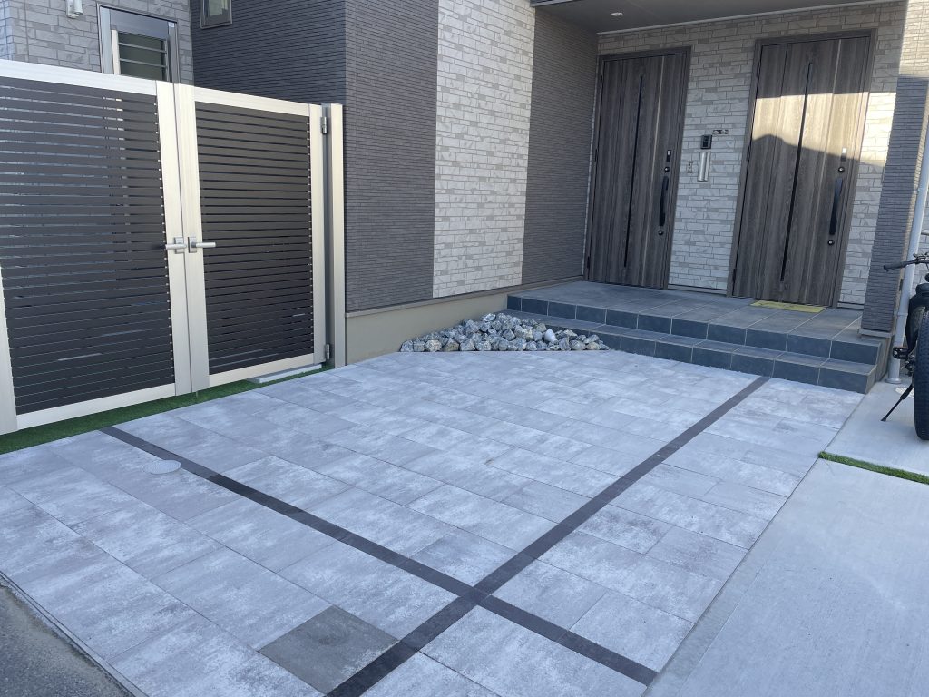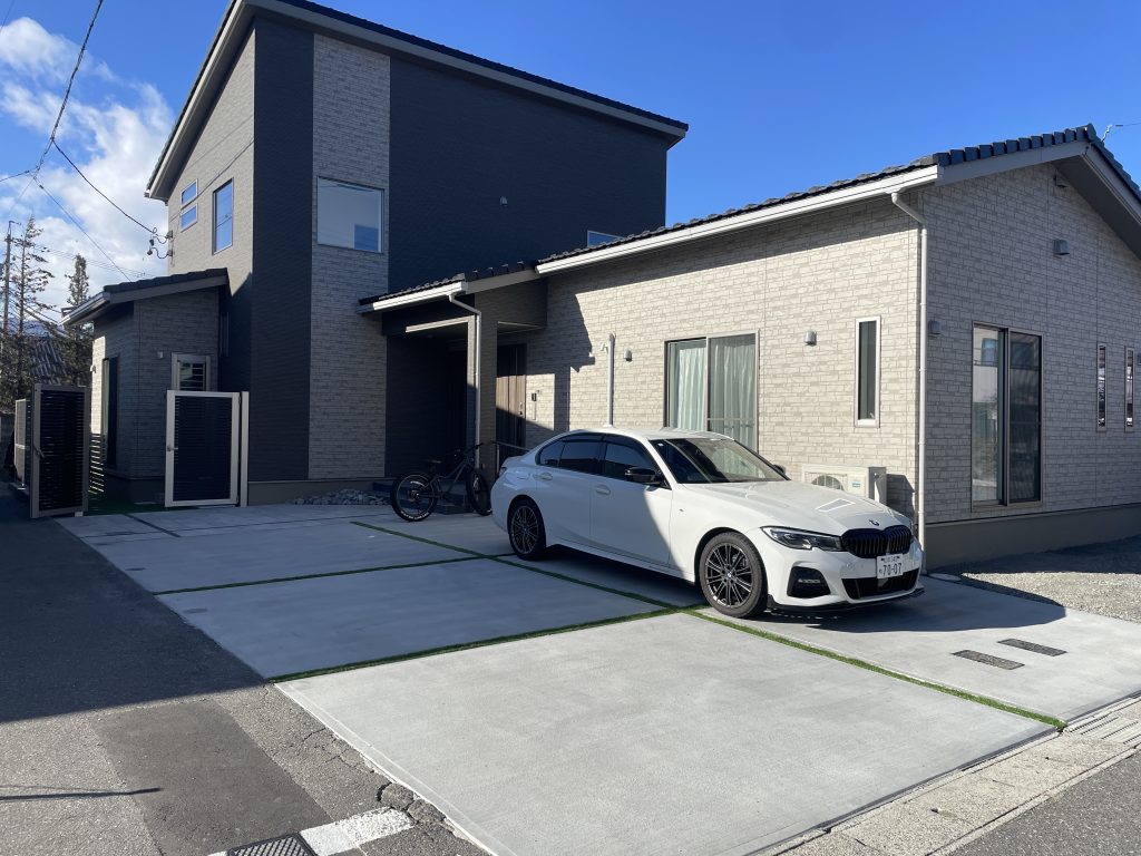 広々とした駐車場、コンクリートの目地には人工芝を敷きました