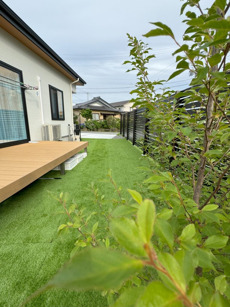 デッキと人工芝、目隠しフェンスで過ごしやすいお庭