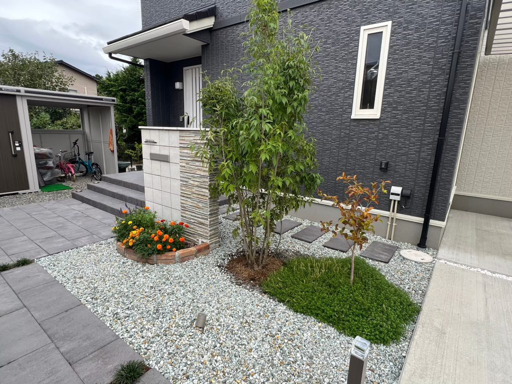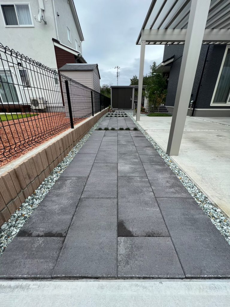 300mm×600mmのインターロッキングで奥行き感のあるアプローチ