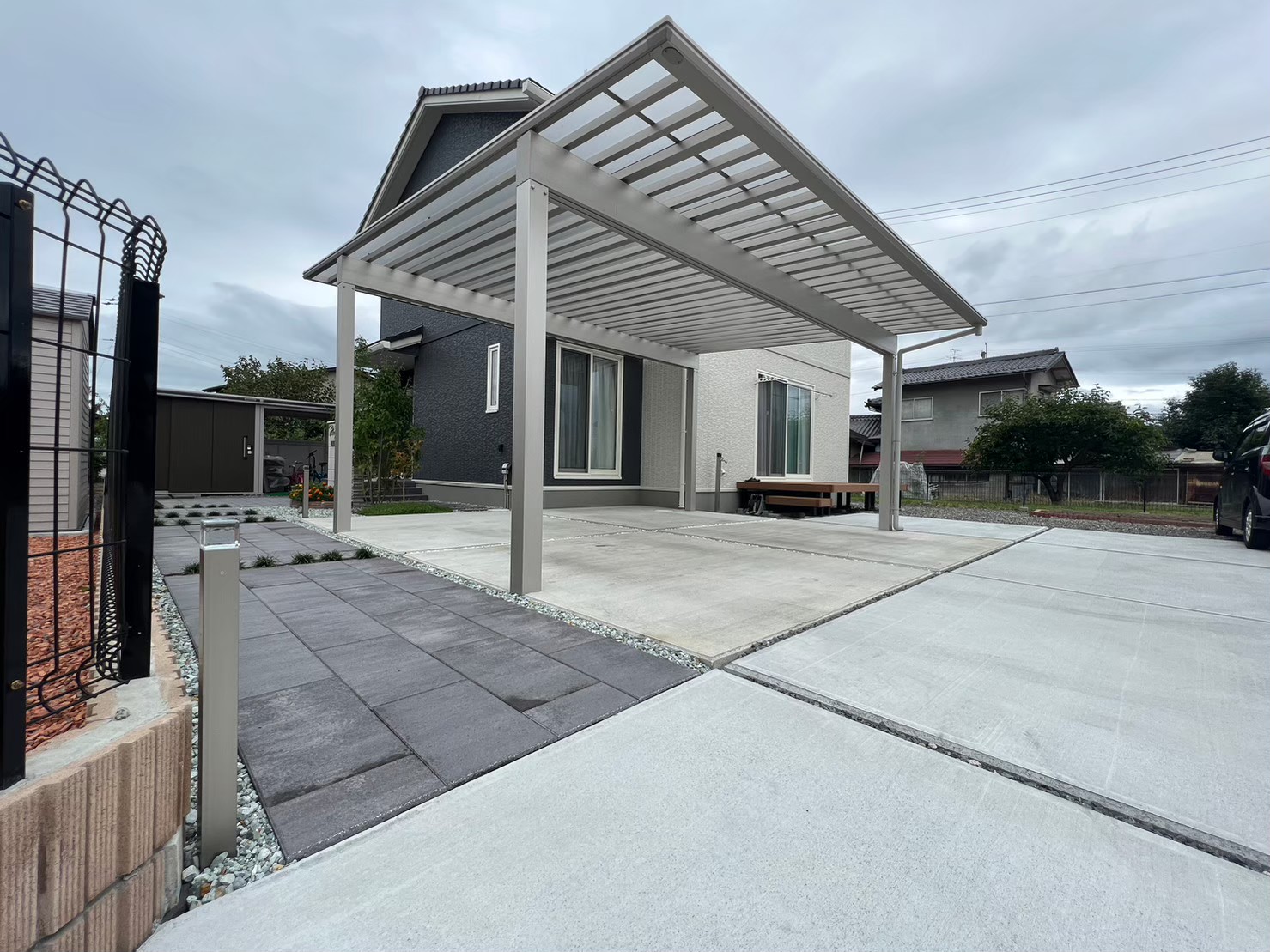 スタイリッシュなカーポートと外壁と調和したインターロッキングで飽きの来ないシンプルなデザイン