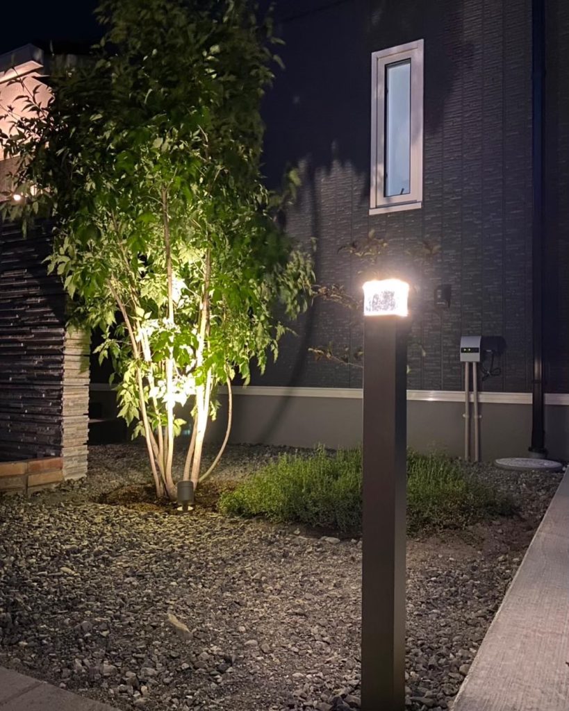 アプローチを照らすポールライトと植栽を照らすスポットライト