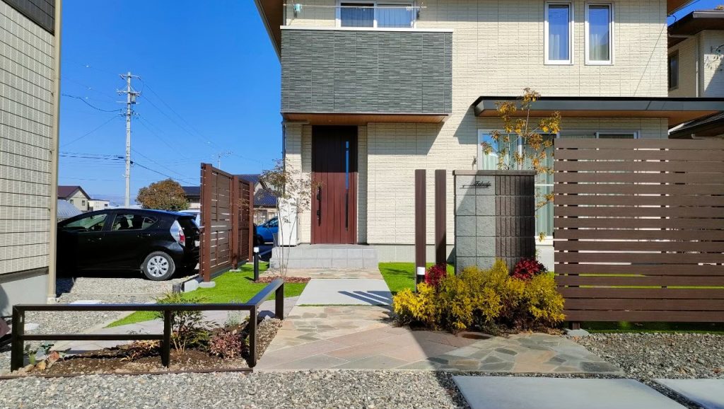 アプローチ・門回りは開放感をもたせ、お庭の前には視線を遮る目隠しフェンスを設置しました。