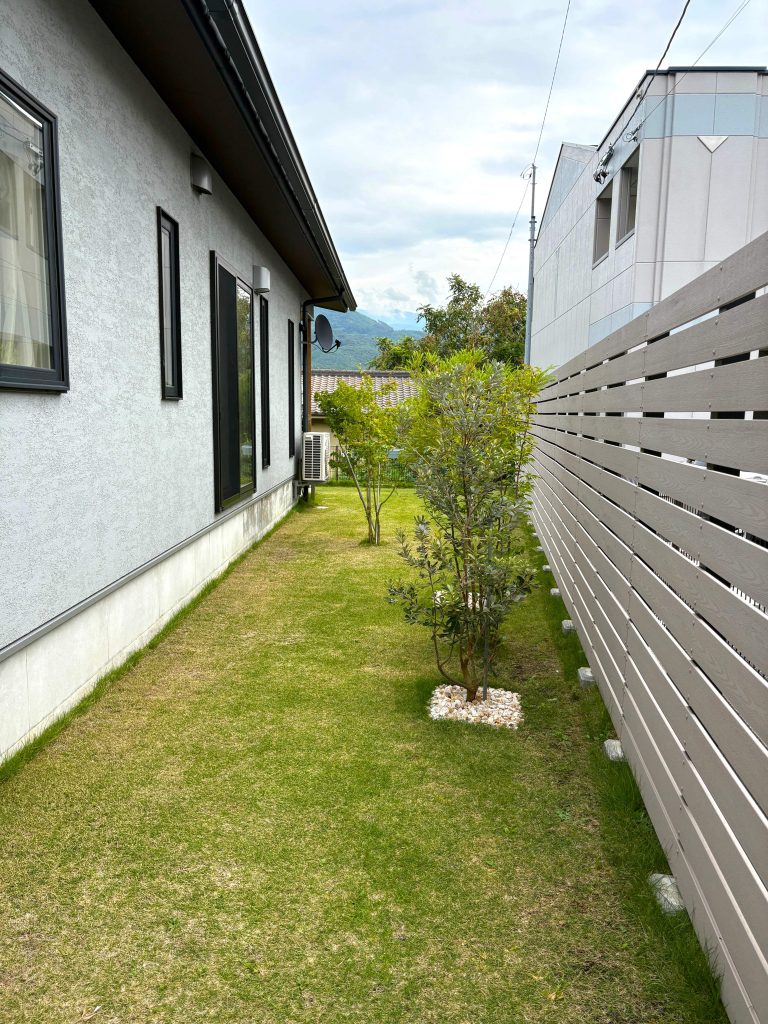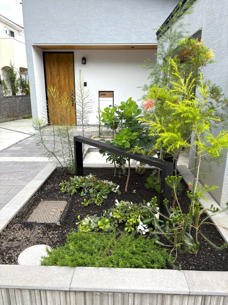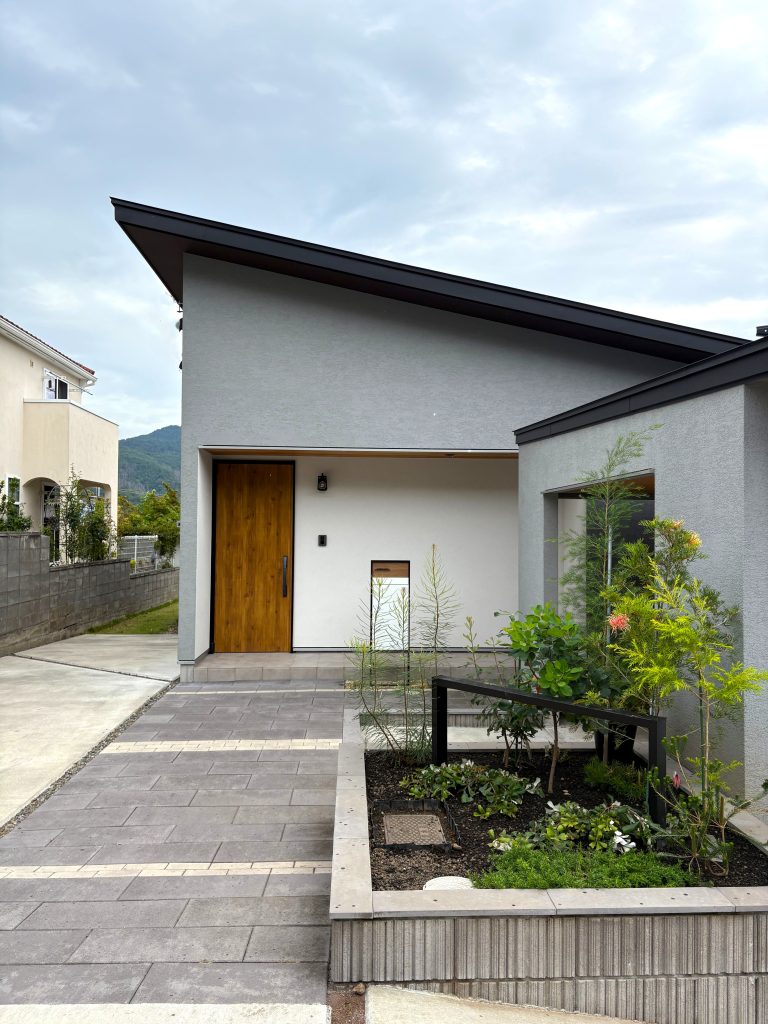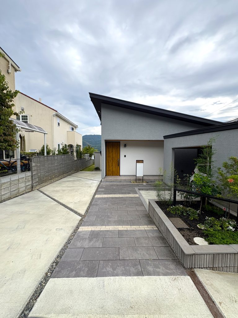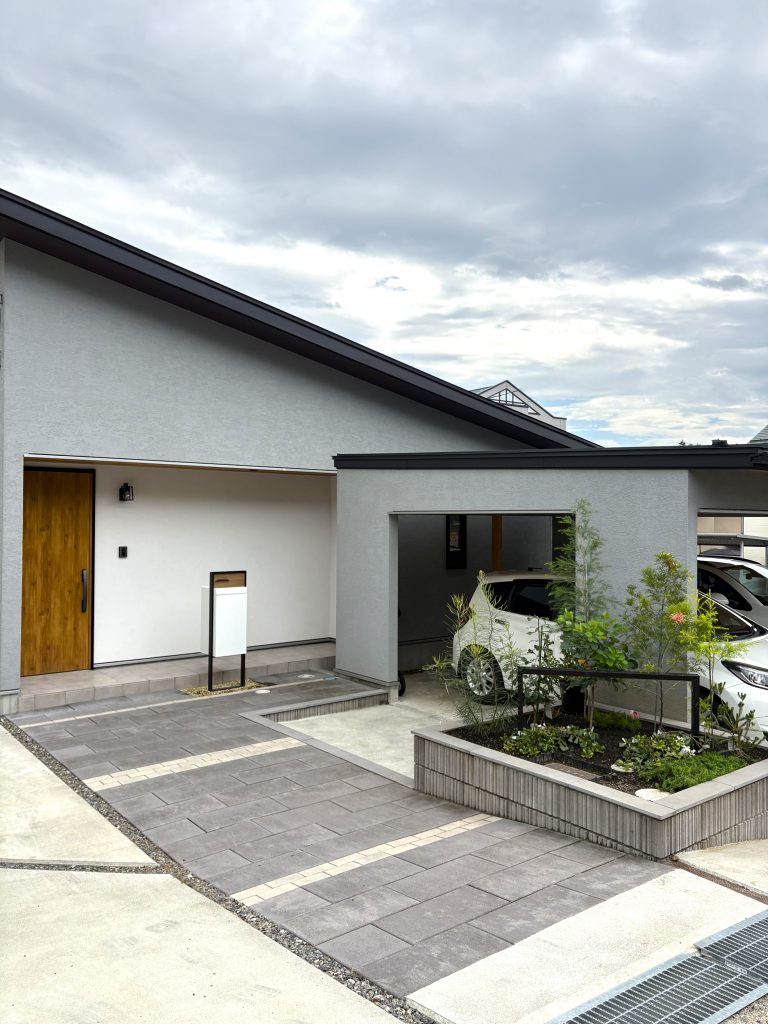 建物の色味に合わせ、グレーで統一した外構デザイン。