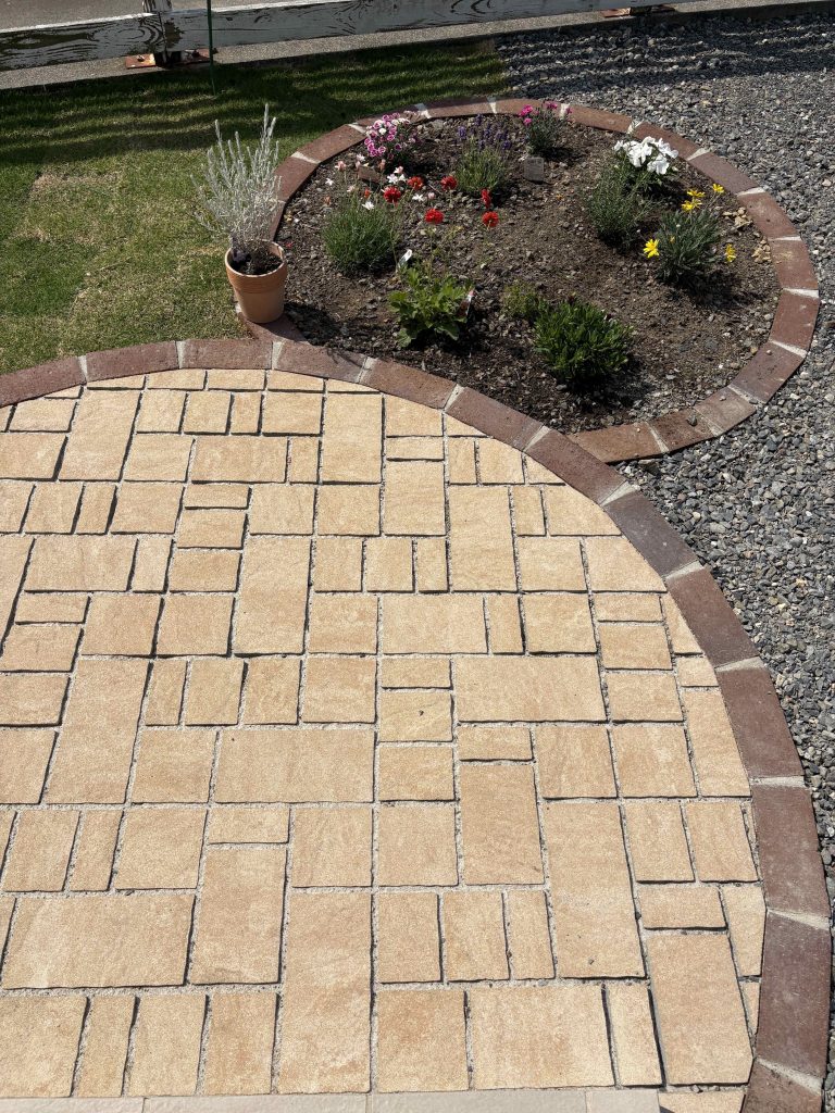 お庭にもアプローチとおそろいのサークルを使い外構全体に統一感が生まれました。