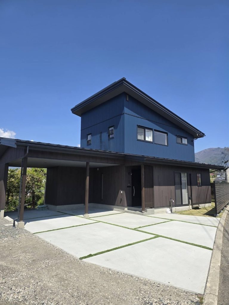 深みのあるネイビーブルーと木目調の建物に合わせ外構は無駄を省いたミニマルなデザインに