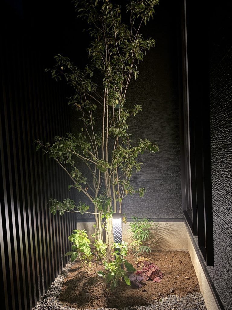 夜には植栽を照らすドットライトの光が美しく浮かび上がり、