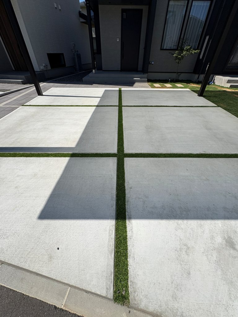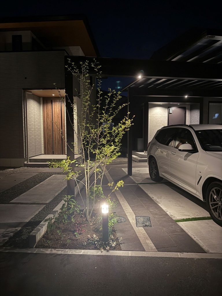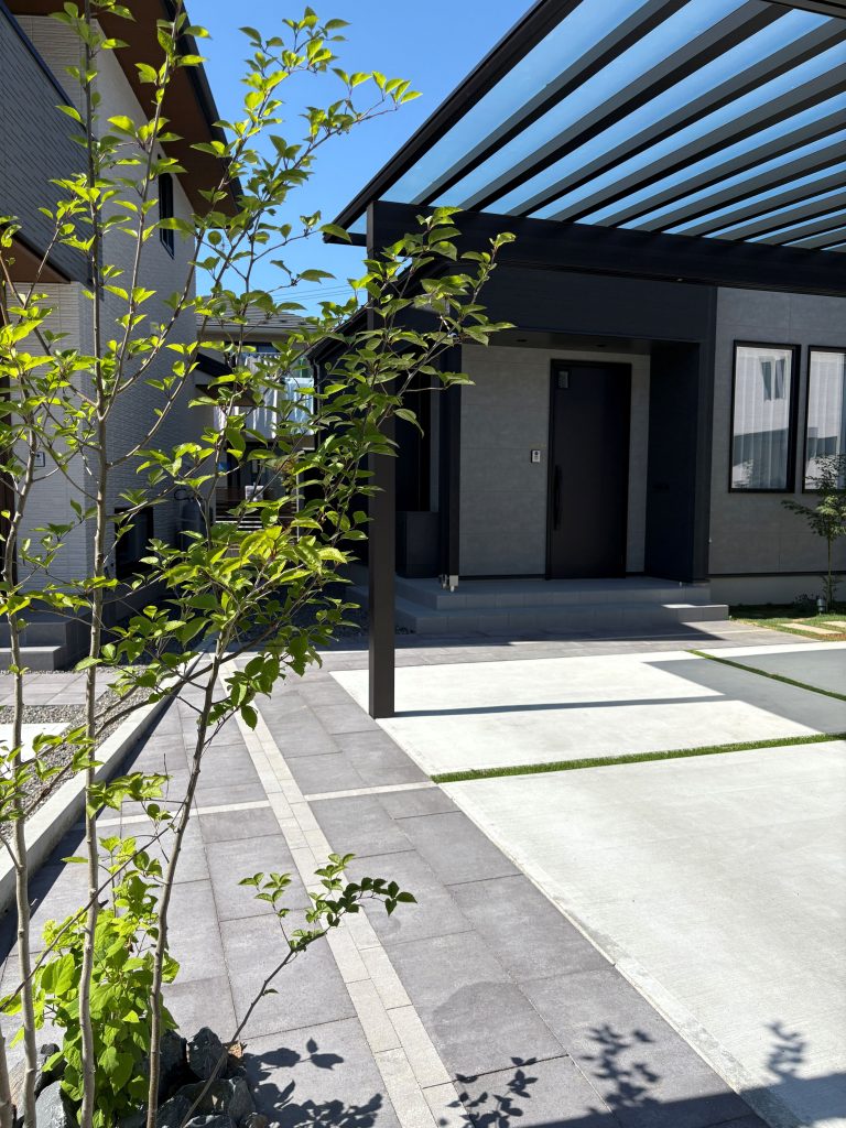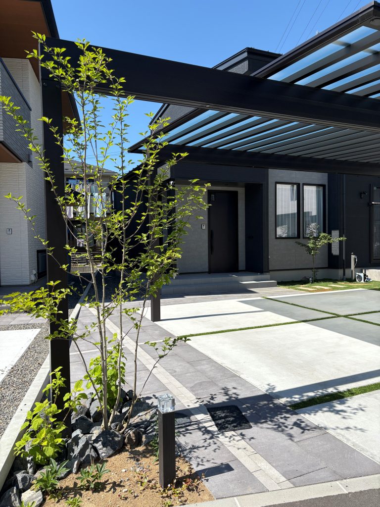 モダンな建物と美しく調和するように、外構も直線的なラインで統一し