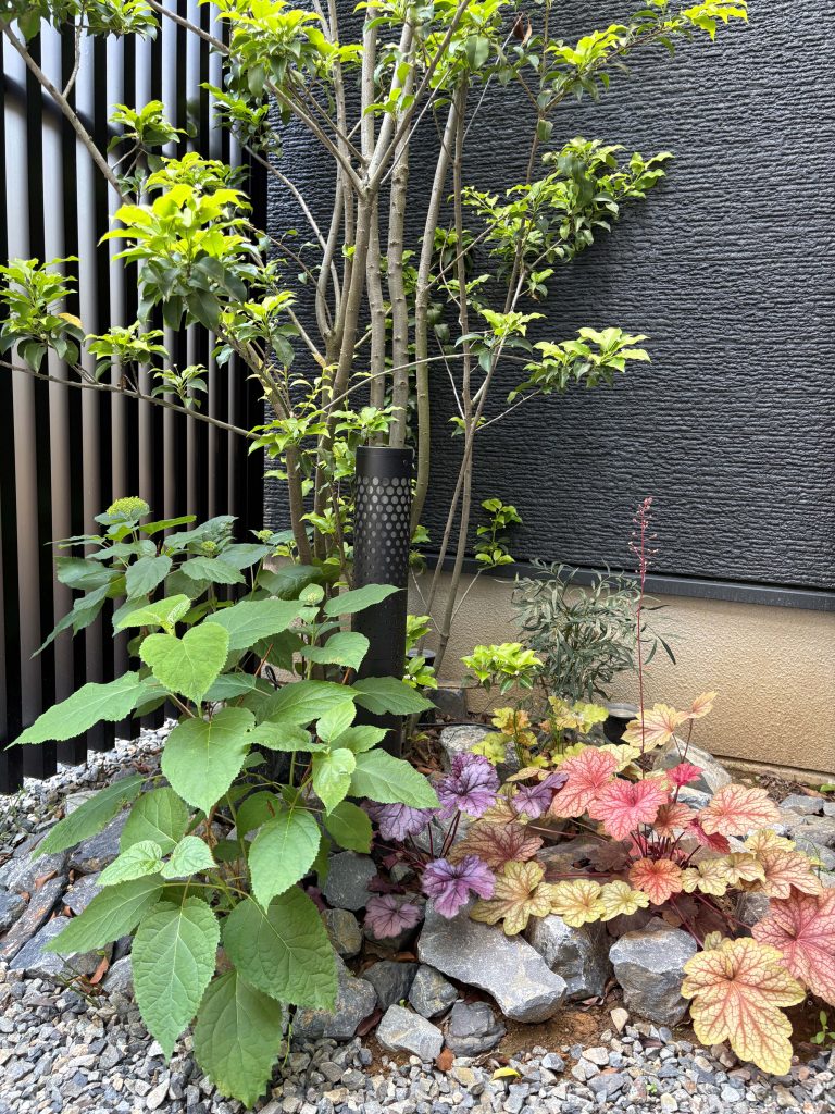 植栽スペースにはゴロタ石を敷いて立体感を演出。