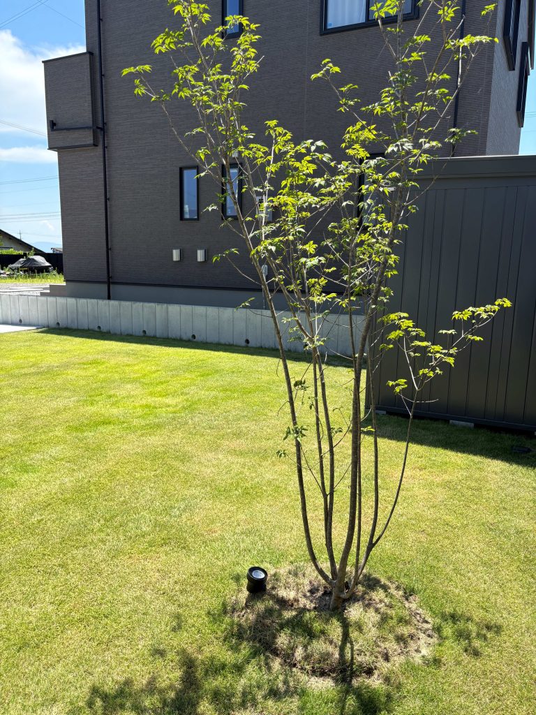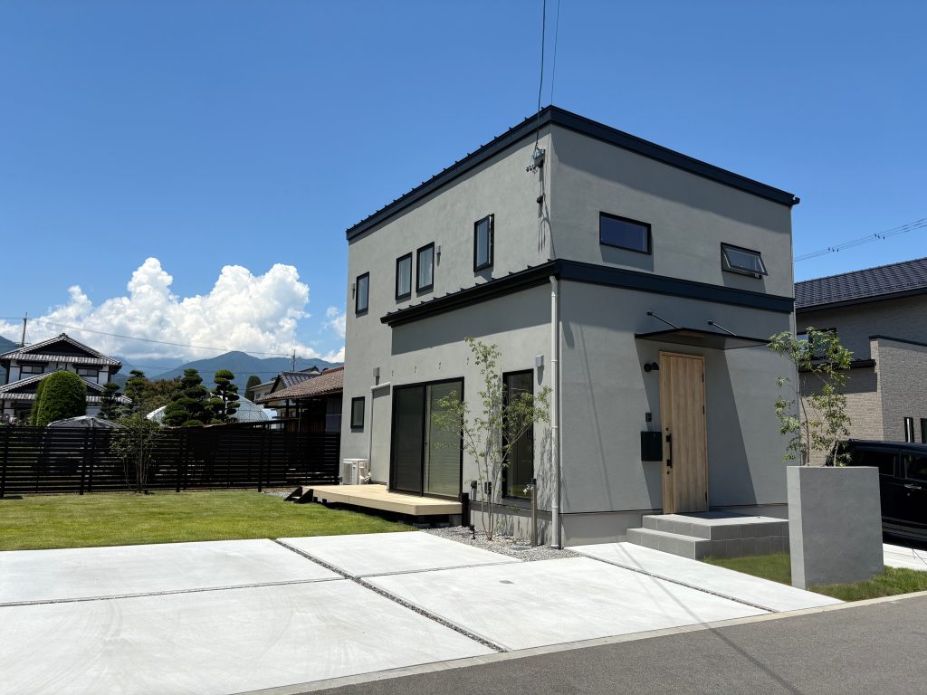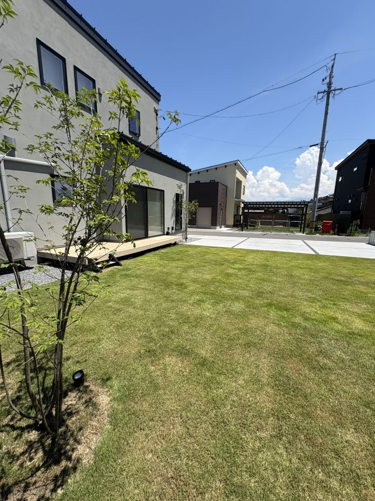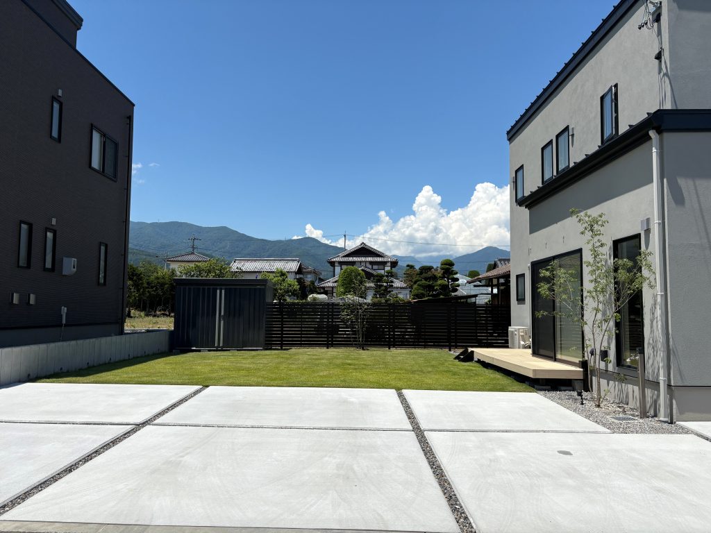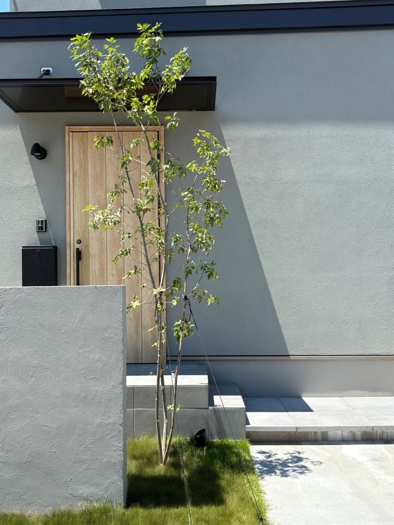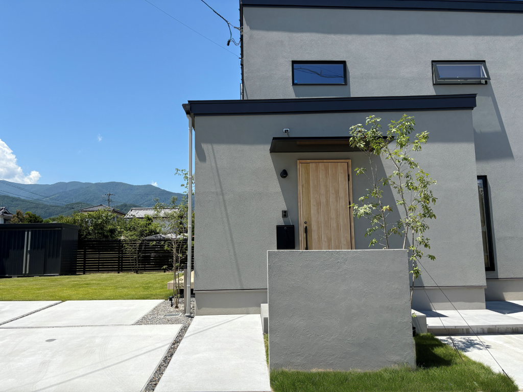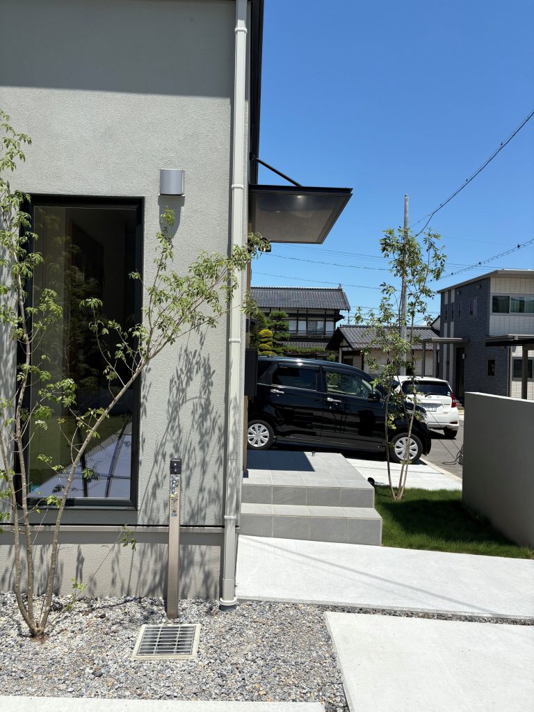 要所に配置された植栽はナチュラルなグリーンで外構に彩りをプラス。