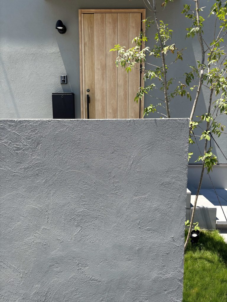門柱は建物と同じ塗り材を使用しトーンを揃えたこだわりの仕上げ。