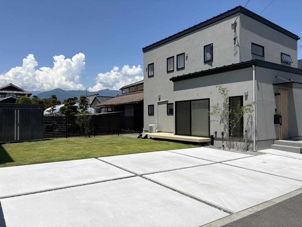 駐車スペースは広々と確保し、シンプルな土間でモダンな印象に。