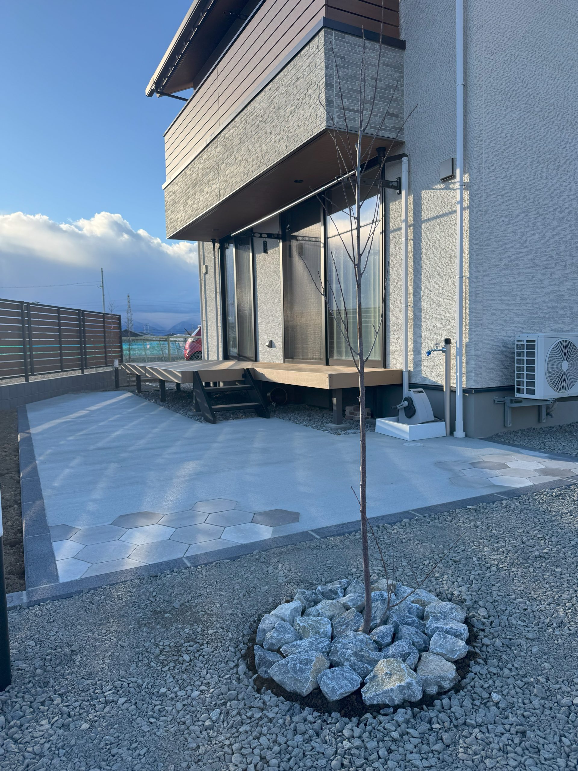 土間コンクリートに六角デザインのインターロッキングを組み合わせた素敵なお庭